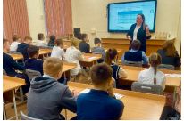 В УК «Ушаковский» прошла встреча в рамках нашего родительского клуба. К школьной доске вышла Елена Викторовна Копылова — мама Александра (7 «З») и Павла (2 «И»), доцент кафедры иностранных языков № 3 РЭУ им. Г.В. Плеханова.